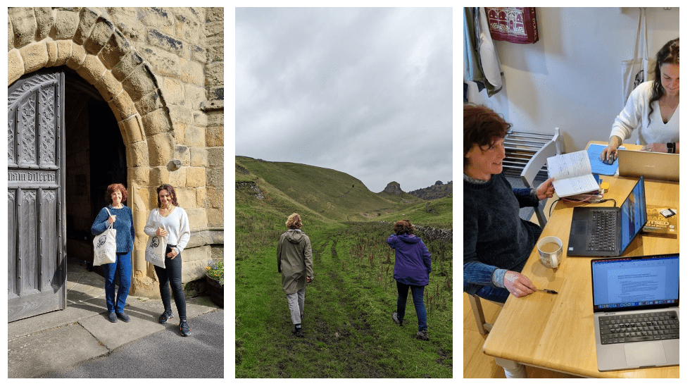 Left to right: Sarah and Rita in front of the church in Tideswell; Liv and Sarah on the path to the gibbet site at Peter’s Stone – a prominent feature in the landscape of Cressbrook Dale in Derbyshire; Sarah and Rita writing at the cottage in Tideswell. Photos by Liv Nilsson Stutz and Rita Peyroteo Stjerna.