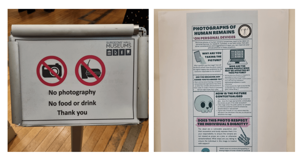 Signeage restricting photography of human remains. Left: at Surgeon’s Hall in Edinburgh, and Right: in the Anatomical Museum at the University of Edinburgh. Photos by Liv Nilsson Stutz.
