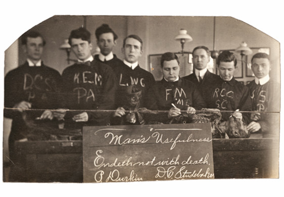 American Medical Student dissection group photograph. The students are posing with the cadaver on a table signed with the name of the school and the year of their class – a common practice to commemorate the event. Photo from Discover Magazine (link above).