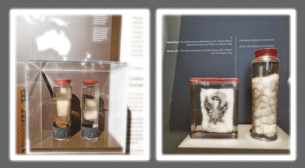 Skin samples on display in the museum. To the left, skin samples form humans from different parts of the world, displayed in the Bittersweet Heritage exhibition. The samples were used by Camper to understand human variation between white and black skin. To the right, human tattooed skin (the face of a woman and the British and Norwegian flags) exhibited with the skin of whale to illustrate Camper’s work in comparative anatomy. Photos by Liv Nilsson Stutz, intentionally blurred.