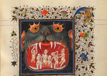 The immaterial soul/body that can still feel pain. Illustrated by Medieval Hellmouth 1. Cropped image of MS M.917/945, p. 180–f. 97r in The Hours of Catherine of Cleves.