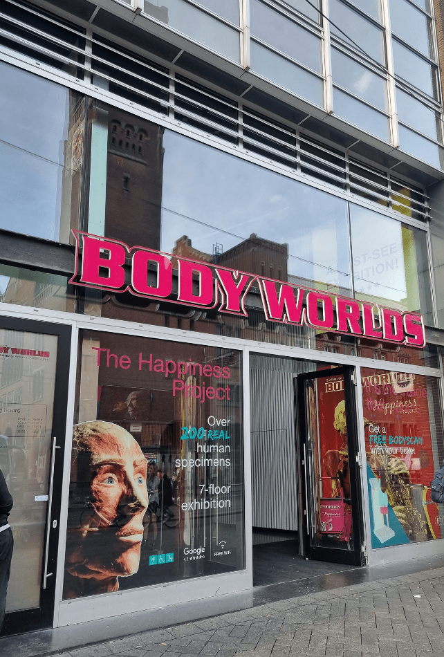 Entrance to Body Worlds in Amsterdam, advertising the exhibition of “over 200 real human specimens” in the midst of the Amsterdam tourist district. Photo by Liv Nilsson Stutz.